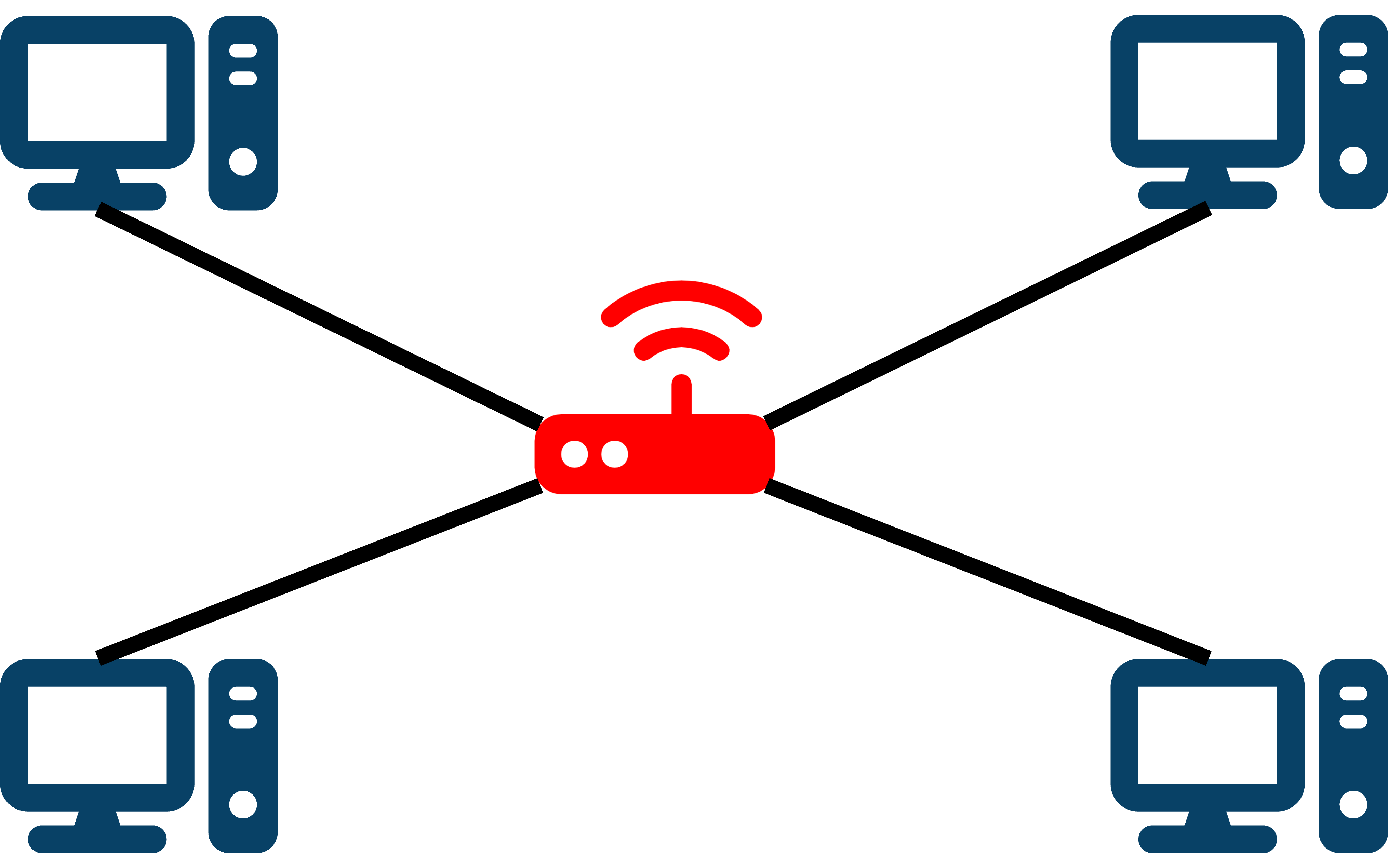 Each device is connected to a central switch or hub (highlighted in red on the diagram). Each device has to be individually connected to the switch, so the failure of one device will not affect the rest of the network. Because of the switch, each device can exchange data with every other device without collisions.