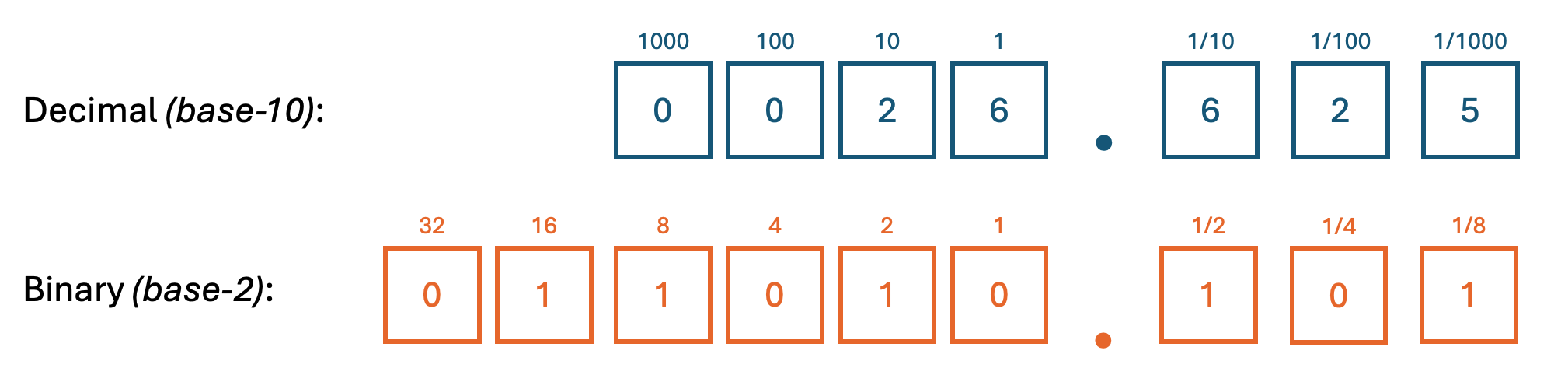 Have you ever wondered how to store fractions in binary? Well, if we add a decimal point after the number and then a digit after that, this digit now represents a half. Add another digit and it represents a quarter. Then one-eighth, one-sixteenth, and so on. This is called Fixed Point Representation, because the decimal point is always fixed in the same place.