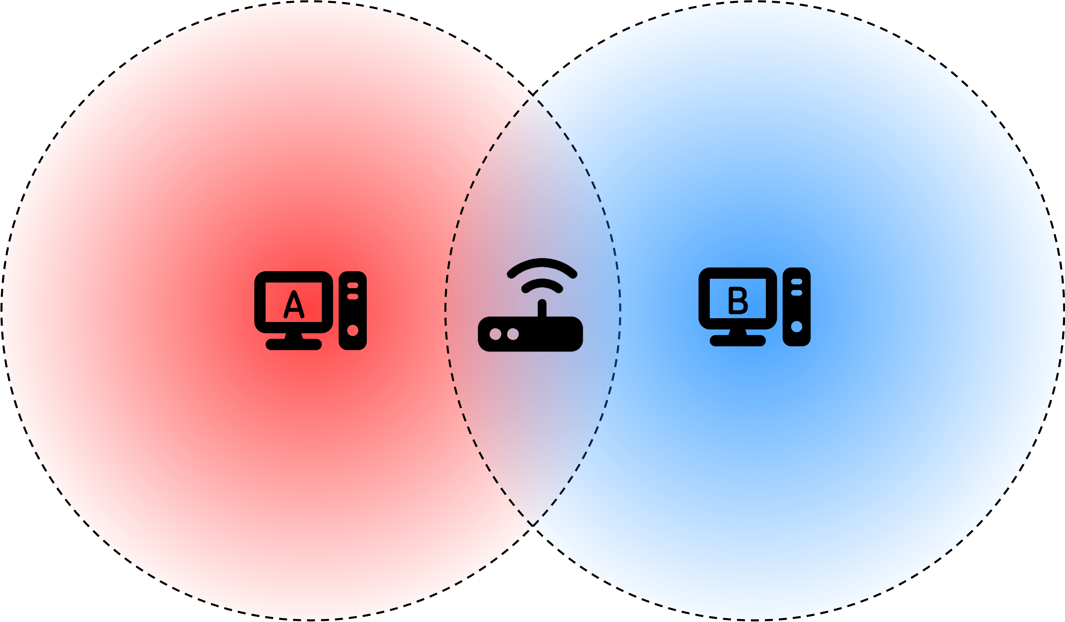 Diagram 1 shows a network with two devices, A and B. The dashed outlines show the range of each device's