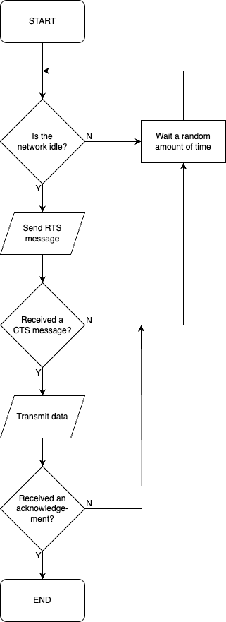 Draw a flowchart of the steps a device would take when attempting to transmit information using CSMA/CA with RTS/CTS.