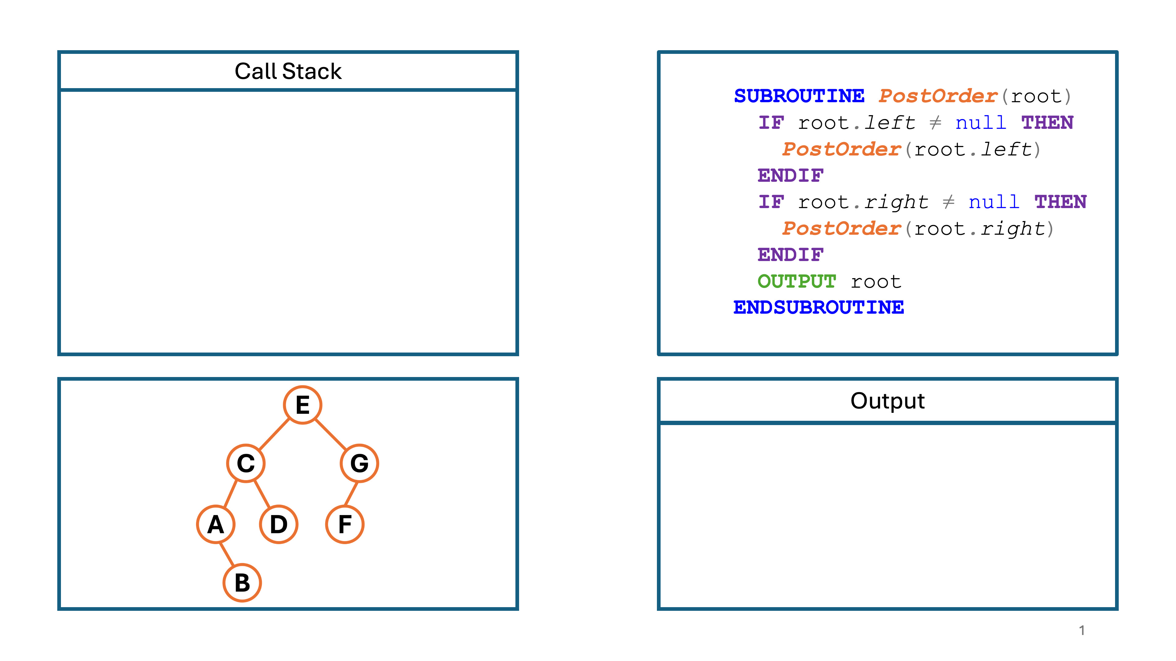 Diagram 1 shows a step-by-step animation of how a post-order traversal would work. Use the arrows to navigate.