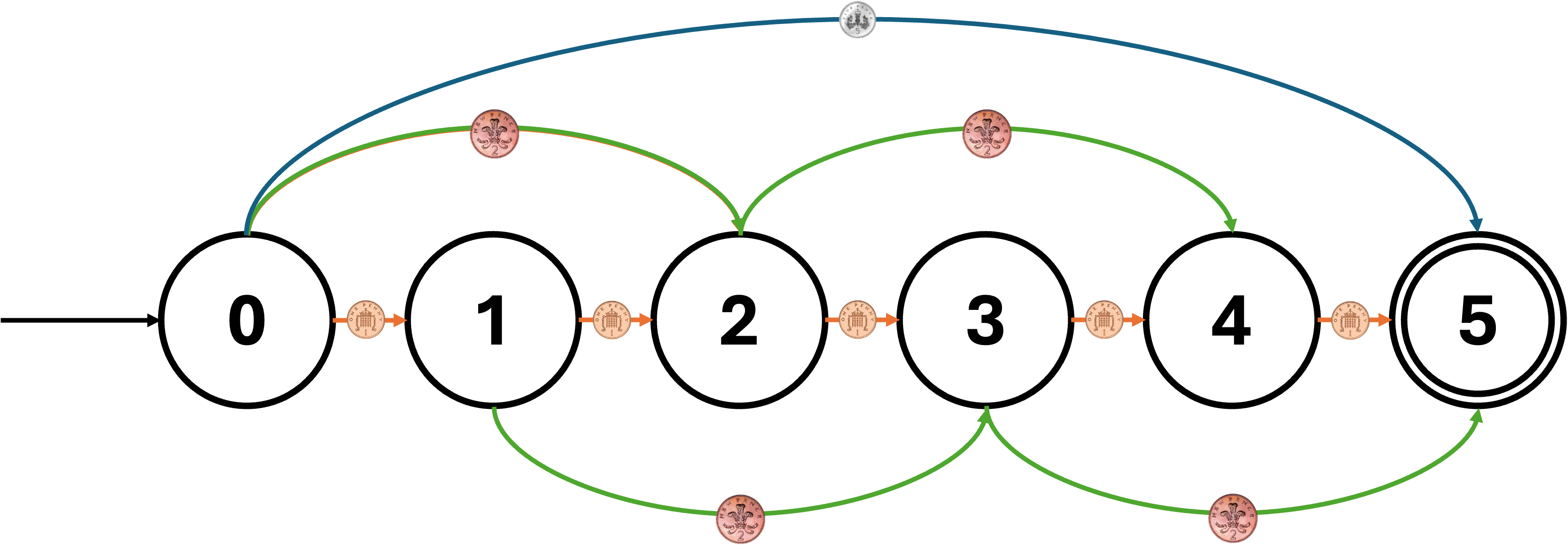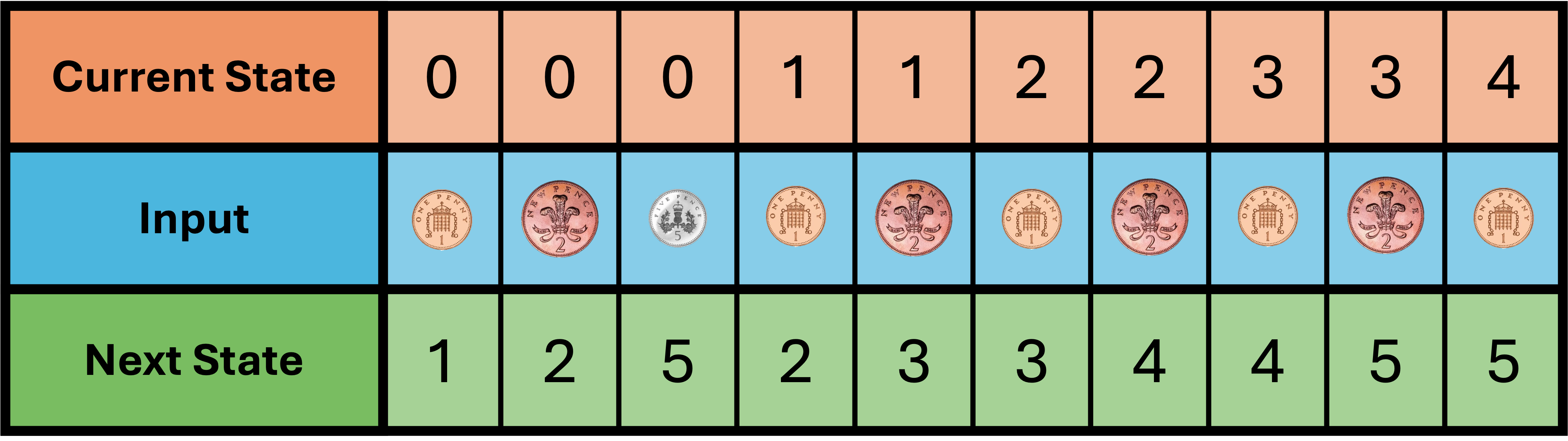 This finite state machine shows the different ways to pay 5p using 1p, 2p and 5p coins. It has 6 states (0 to 5), each showing how much money has been paid already. The arrows show the transitions between the states: each arrow has an input (1p, 2p or 5p coin) attached to it. The initial state, 0, has an arrow going into it. The final state, 5, has a double outline to show the process terminates there.