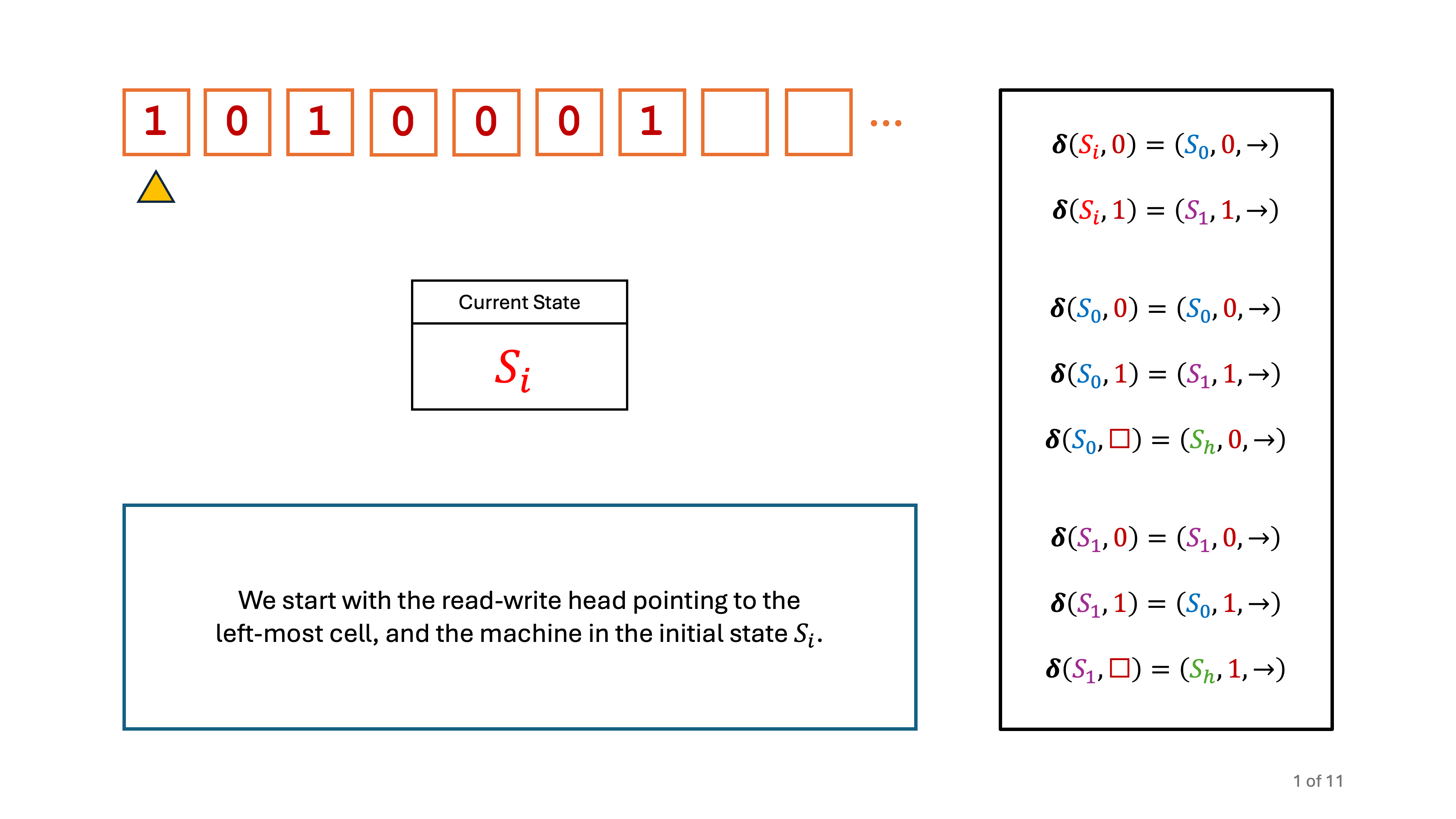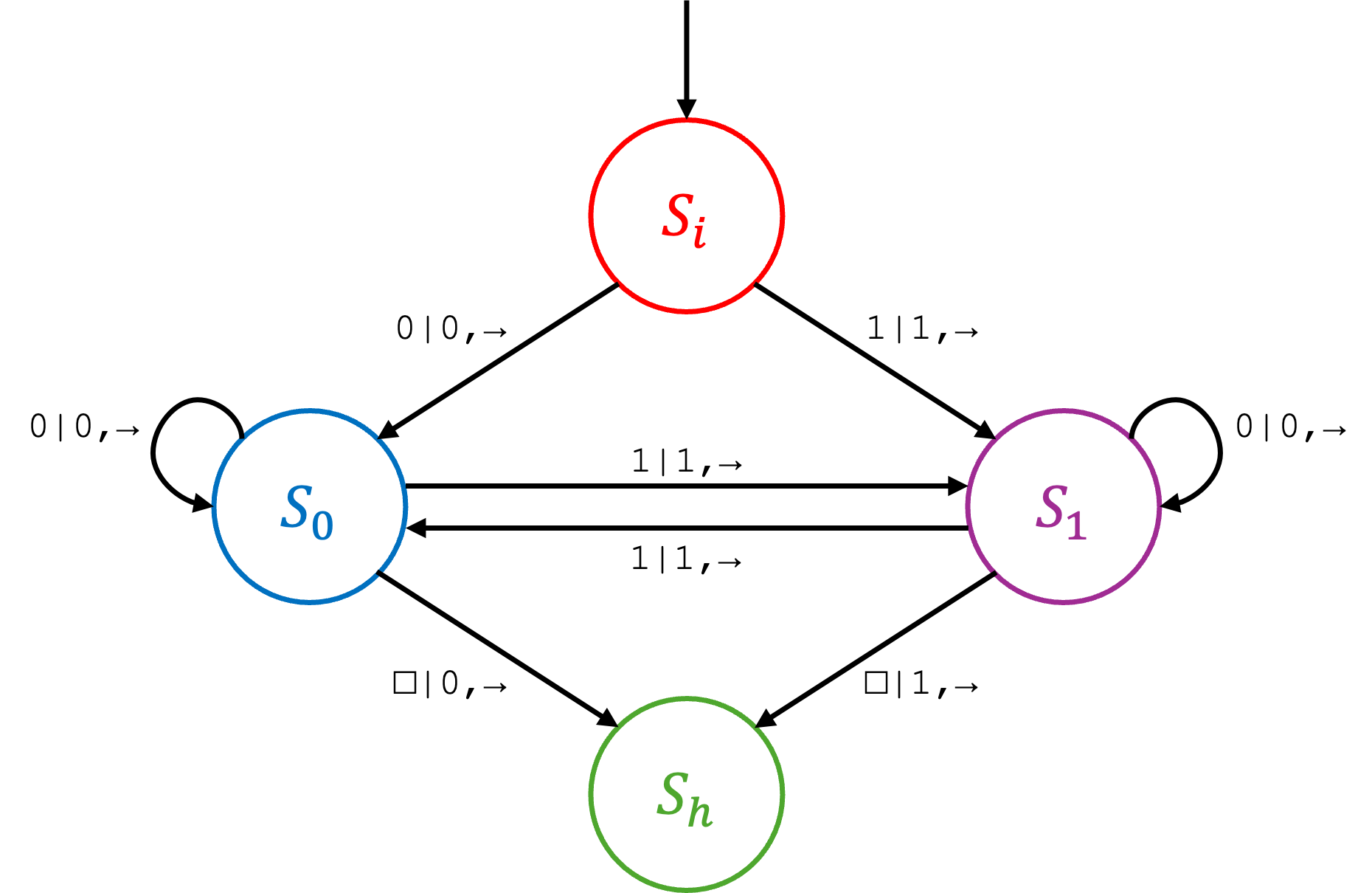 Diagram 1 shows a step-by-step animation of a Turing machine which computes the even parity bit of a string of bits. Use the arrows to navigate.